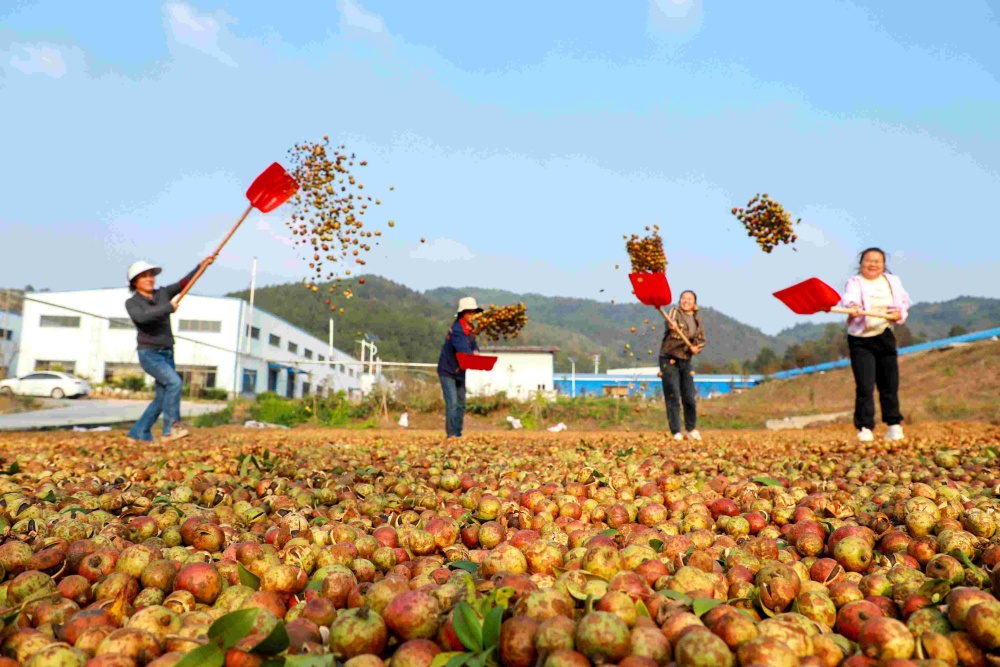 初冬时节,贵州省黔东南苗族侗族自治州从江县种植的油茶果迎来全面收获期,村民们抢抓晴好天气晾晒油茶果,乡村呈现一派繁忙景象。11月12日,贵州省从江县丙梅街道居民在晾晒油茶果(无人机照片)。目前,该县油茶种植面积累计达17.16万亩,挂果面积8.23万亩,今年预计产茶籽产量约8200吨,产值约1.2亿元。
