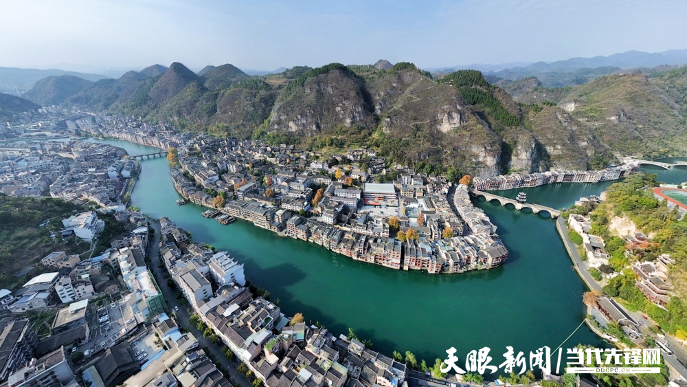 河水如碧绿的绸带蜿蜒穿城,阳光透过云层洒下,河面波光粼粼,与岸边建筑的倒影交织,青龙洞古建筑群依山而建,飞檐翘角在冬日暖阳下更显雄奇,勾勒出一幅浓淡相宜的冬日画卷。