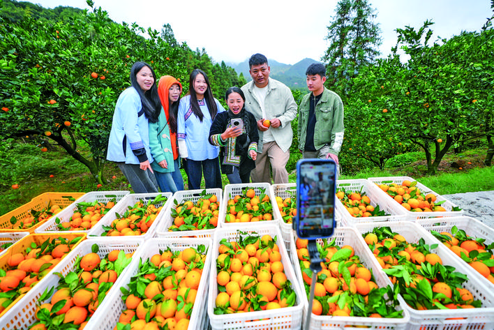 11月15日,阳光明媚,在网络上悄然走红的黄平飞云崖景区,吸引了众多游客前来探访。 - 榕江:果园直播抢“鲜”卖