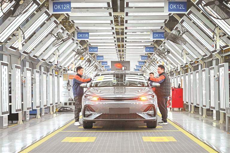 1月19日,位于贵阳市观山湖区的贵州吉利汽车制造有限公司生产车间内,工人开足马力赶制订单。该公司不断加大产品研发力度,积极拓展国内外市场,产品已出口至中东、南美、非洲等地。去年总产量达26.2万台,产值230亿元。 - 数字工厂推动产业升级——实体经济向“黔”行系列报道之十
