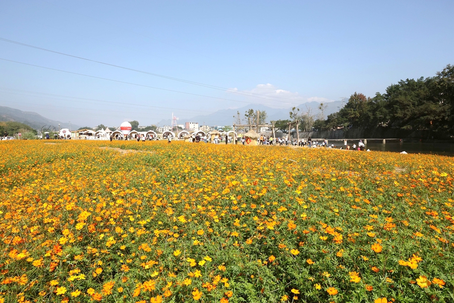 近日,贵州省黔东南苗族侗族自治州榕江县古州镇三宝侗寨开心岛的硫华菊竞相绽放,吸引众多游客前来观光游玩,拍照打卡,沉浸式感受鲜艳灿烂花海,硫华菊花海成为三宝侗寨一道亮丽的风景。