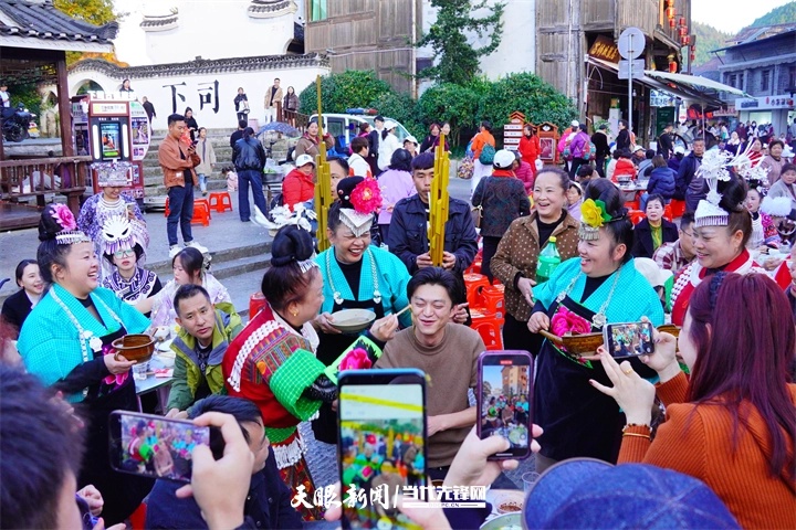 当天,打糍粑、芦笙舞、长街宴等系列原汁原味的民俗活动轮番上演,为广大游客献上了一场沉浸式的苗族文化体验。夜幕降临,熊熊篝火在芦笙广场燃起,游客们与当地群众手拉手,跳起欢快的芦笙舞,尽情“蹦苗迪”,为这场年度文化盛宴画上了一个热烈而浪漫的句号。而贯穿活动的中流砥柱,当属在清江街举行的苗家庖汤肉长街宴。