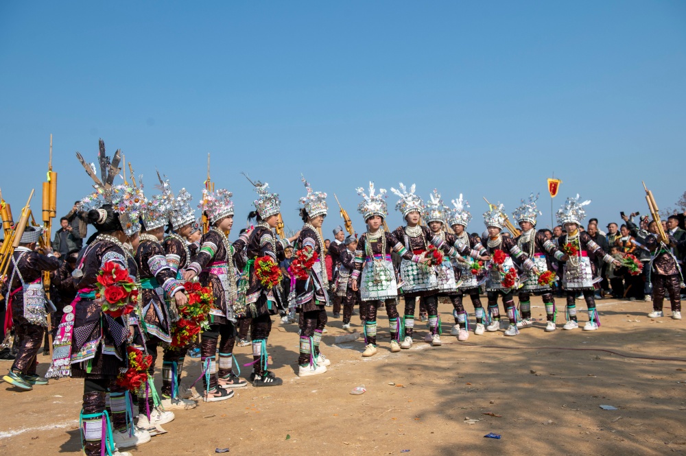 1月11日,在贵州省从江县丙妹镇大塘村,选手在吹奏芦笙。当日,贵州省黔东南苗族侗族自治州从江县丙妹镇大塘村首届芦笙友谊比响大赛拉开帷幕。人们通过吹奏芦笙、跳起芦笙舞,共同庆祝丰收,展示民族技艺,在竞技与交流中深化友谊、促进团结。