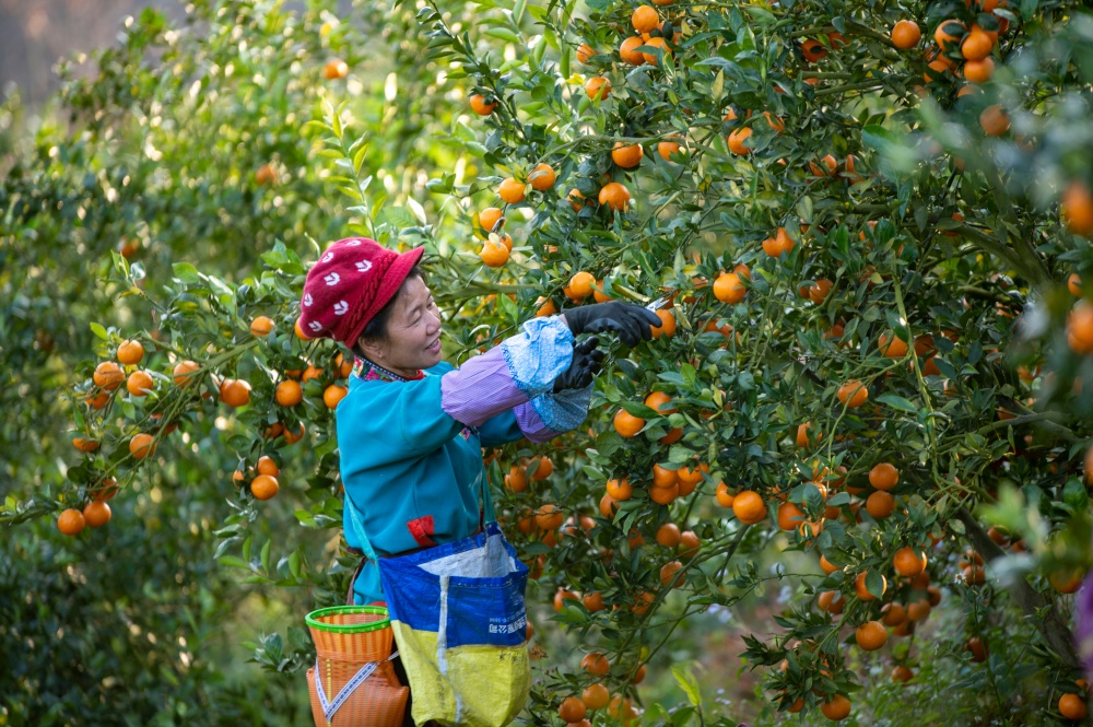 1月13日,村民在贵州省从江县丙妹镇大塘村皇帝柑园采摘皇帝柑。近日,贵州省黔东南苗族侗族自治州从江县丙妹镇大塘村的皇帝柑种植基地迎来丰收季,村民正有序进行采摘、分拣、装车等工作,金黄的果实映衬着忙碌的身影。近年来,从江县依托生态优势,通过“基地+能人+农户+电商”模式盘活闲置土地,发展精品水果产业,并推动农旅融合,有效带动农民增收,助力乡村振兴。