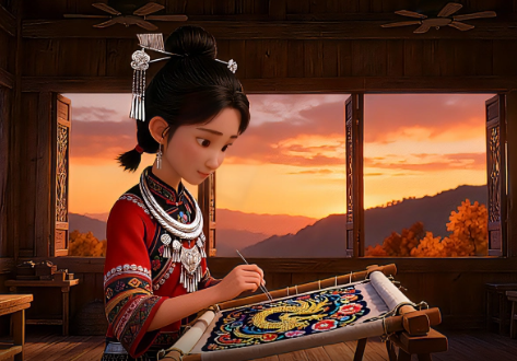 电视剧《乌蒙深处》的女主角衮月亮是一名苗绣非遗代表性传承人,在AI世界的一个苗寨里,也有一名苗绣非遗代表性传承人——阿彩,她从8岁开始跟着妈妈学习苗绣。在苗绣启蒙时,妈妈告诉阿彩,在苗族文化中,蝴蝶妈妈是孕育万物的起源,传说它是从枫树心里诞生的,蝴蝶妈妈把世间的万物都变成了图案,教会了苗族先辈苗绣的技艺。
