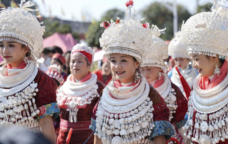 11月16日,在黔东南州黄平县谷陇“九·二七”芦笙会非遗游演现场,苗族银饰成了最耀眼的风景。数百名身着盛装的苗族同胞组成流动的“银海”,银冠、项圈、耳坠、腰链随步伐轻摇,花鸟鱼虫等纹样在阳光下熠熠生辉。