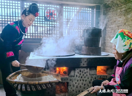 “妈,你来帮我烧火。” 1月5日,凯里市三棵树镇南高村脚高上寨阿妮酸汤坊里,女儿吴传美的话一落,73岁的母亲李胜美笑盈盈地从柴房抱出几节竹段,坐在炉灶前的小板凳上,熟练地劈成竹块,扔进炉灶,红彤彤的火焰燃起,母女俩“搭档”制作白酸汤的日常便开始了。