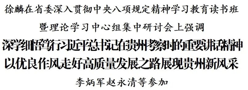 3月29日,省委深入贯彻中央八项规定精神学习教育读书班暨理论学习中心组集中研讨会在贵阳举行。省委书记、省委党的建设工作领导小组组长徐麟主持会议并讲话。他强调,要深学细悟笃行习近平总书记在贵州考察时的重要讲话精神,扎实开展深入贯彻中央八项规定精神学习教育,以优良作风走好高质量发展之路展现贵州新风采。