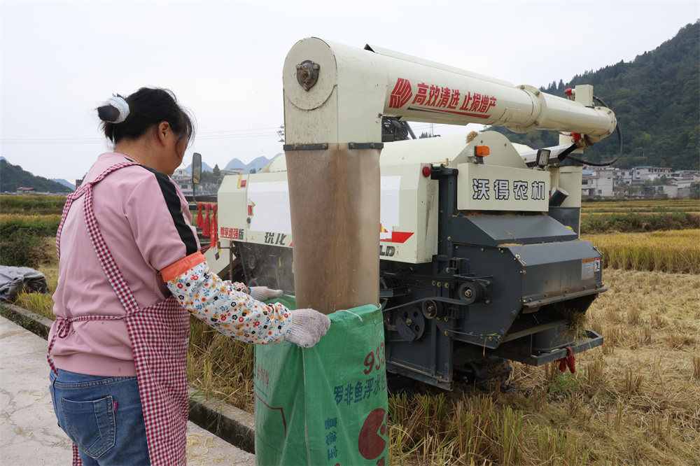 在谷硐镇谷硐村,麻江县富锌硒农业发展有限公司负责人赵祥榕正在帮锌硒米种植户孟信英收割水稻。