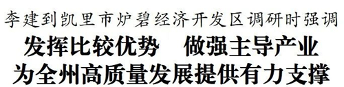 11月8日,省政协副主席、州委书记李建到凯里市炉碧经济开发区调研。他强调,要深入学习贯彻习近平总书记视察贵州重要讲话精神和习近平总书记对推进新型工业化作出的重要指示精神,把高质量发展的要求贯穿新型工业化全过程,充分发挥比较优势,做大做强主导产业,为推动全州高质量发展提供有力支撑。