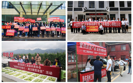 一是以“千企帮千村”工作为载体,截至2021年3月底, 五年来共有953家民营企业、商协会到我州结对帮扶1428个村,受帮扶贫困人数303442人。其中,产业帮扶项目投入资金144690万元,帮扶人数108309人;就业帮扶发放工资总额20727万元,帮扶人数10801人;公益帮扶捐款捐物5256万元,帮扶人数191605人;技能帮扶企业投入资金515万元,帮扶人数4078人。二是定点帮扶工作取得实效。2020年为解决帮扶村镇远县青溪镇铺田村生产的玫瑰花系列产品的销售困难问题,州工商联领导班子及党员干部共到帮扶村调研走访80余人次;5月份党支部组织摆摊设点帮助推销和宣传玫瑰花系列产品,积极对接销售企业,帮助该村解决了滞销产品;6月份为该村解决经费5万元,用于该村自办企业产品品牌建设;8月底州工商联开展消费扶贫活动,向该村购买滞销辣椒1000余斤;9月中下旬,秋收之际恰遇连绵雨季,州工商联领导带队到青溪镇指导秋粮抢收;重阳节和春节分别开展节日慰问活动,共慰问21户贫困户,每户发放慰问金600元,共计12900元。