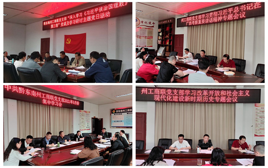 州工商联党支部按照党中央、省委、州委部署要求,高标准、严要求深入开展党的群众路线教育实践活动、“三严三实”专题教育、“两学一做”学习教育、“不忘初心、牢记使命”主题教育和党史学习教育,努力做到知行合一,学用结合,形成学习教育常态化制度化。一是通过讲党课、参观、主题讨论、调研等灵活多样的形式高质量开展支部学习、“三会一课”和主题党日活动以丰富组织生活。支部书记和党员领导干部带头讲党课,党课主题丰富,内容切合实际需求,比如 《通过疫情,看工商联系统理想信念教育的重要性》《新中国史之工商联发展》等党课;“七一”期间组织党员干部开展“你,为什么入党?”专题讨论、重温入党誓词;开展志愿者支持凯里市创建文明卫生城市系列活动、老党员讲入党故事等,确保每月开展1次主题党日活动;二是持续开展中国特色社会主义和中国梦学习教育,组织全体干部职工参与“学习强国”、“法宣在线”、国家工作人员学法用法学习考试平台、“百万公众网络学习工程”小程序的学习,参与率均为100%。三是开展向先进典型学习,组织学习杨荣、黄和艳等同志先进事迹,营造崇德向善的浓厚氛围。