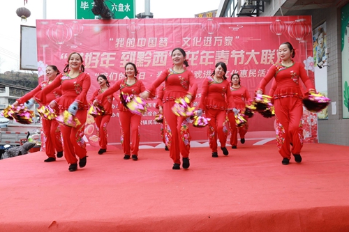 “戏剧进村”文化惠民演出、送福送春联、猜灯谜…… 2月6日,黔西市甘棠镇龙年“村晚”活动正在联新社区上演。