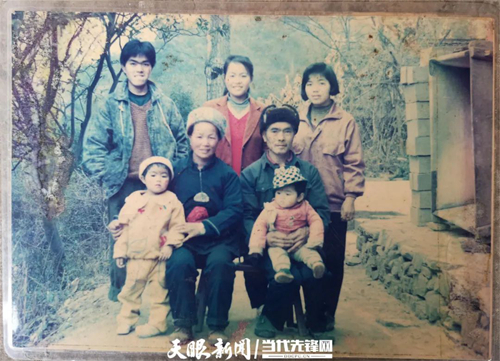 27年前金海朝怀抱儿子、胡英兰(身边站着女儿)合影(金海朝供图)