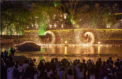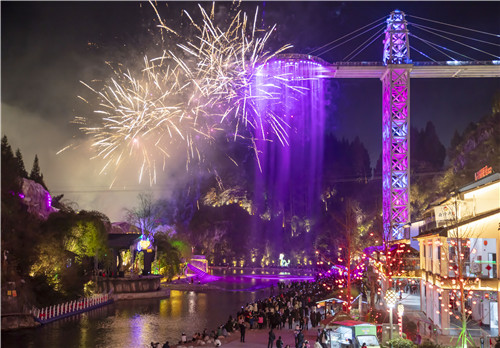 春节期间,施秉县杉木河景区举行非遗打铁花表演、烟花点亮杉木河等民俗活动,铁花、烟花漫天飞舞,与杉木河水交相辉映,绚丽多彩,为游人奉上了一场流光溢彩的视觉盛宴。