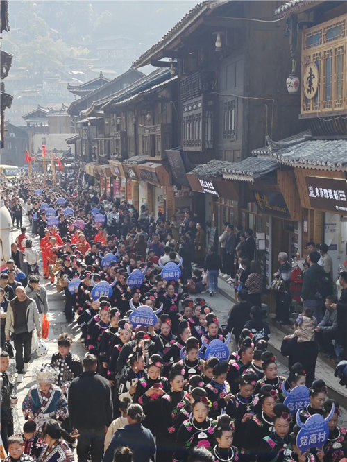 中午2点,75个村寨的1500多名姑妈姑爹组成的舞龙队、回娘家礼物方阵、银饰盛装等八个方阵在西江举行了盛大的文化巡游展示。