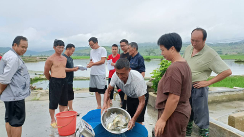 “领到鱼苗后,大家马上要拿到田里面去放,停留时间久了,鱼苗容易缺氧,影响成活率,还没开好沟的稻田在鱼苗投放后要把沟开好……”铜鼓镇农服中心主任杨长泽耐心地向领取鱼苗的农户讲解投放养稻花鱼苗注意事项。