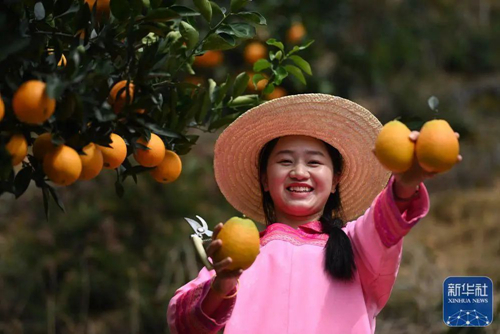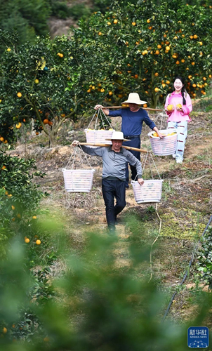 11月19日,员工在榕江县古州镇料里村五榕脐橙种植基地采摘脐橙。新华社发(李长华摄)