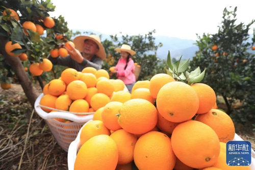 11月19日,员工在榕江县古州镇料里村五榕脐橙种植基地采摘脐橙。新华社发(杨成利摄)