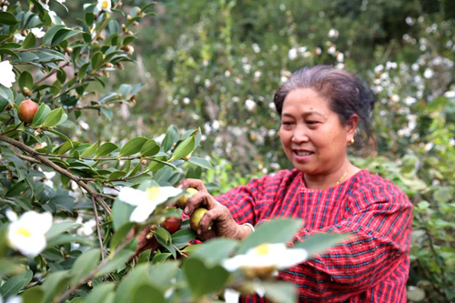 冬日暖阳,走进天柱县油茶林里,油茶花竞相绽放,一簇簇、一团团,连绵起伏的油茶林俨然化作雪白的花海,清香四溢。基地里,游客穿行其间休闲赏花游玩,村民挎着竹篓捡茶籽。在天柱县贵州恒生源公司的晒场上,百余人在分选油茶果,公司生产车间加工生产如火如荼,一瓶瓶山茶油灌装下线,供应市场。