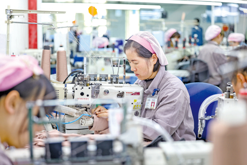 2月18日,在三穗县贵州鼎盛服饰有限公司生产车间,工人正忙着赶制订单。