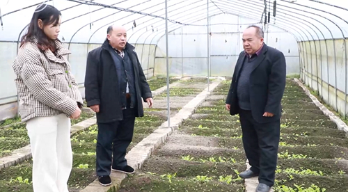 在丹寨县台辰村蔬菜种植基地,丹寨县农业农村局技术人员潘万朝仔细查看白菜苗生长情况,现场指导种植户科学进行蔬菜水肥管理,避免低温造成冻害,提高蔬菜苗成活率,最大程度减少低温天气造成的损失。