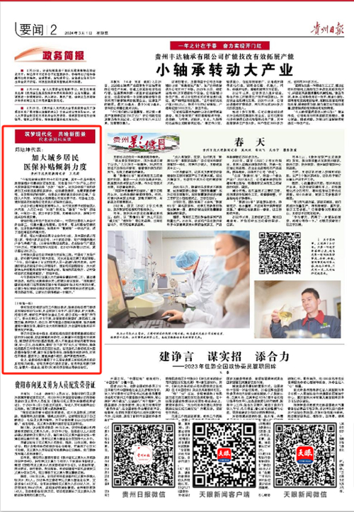 《贵州日报》关注岑巩籍全国人大代表郑培坤:加大城乡居民 医保补贴倾斜力度