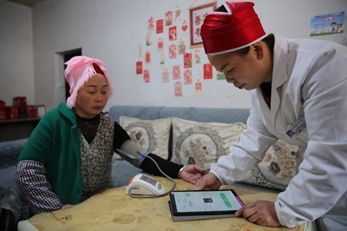 “这个‘健康包’里面装很多宝贝呢!有可以快速连接平台的血压计、血糖仪等设备,我们每次测量乡亲们的血压血糖,通过平板系统直接上传数据到镇里的中心卫生院,他们第一时间可以看到。”王碧边走边和记者聊着。她说,没有“健康包”的时候,他们每一次出诊测量之后,得慢慢拿着纸和笔记录,非常麻烦,现在就非常方便。