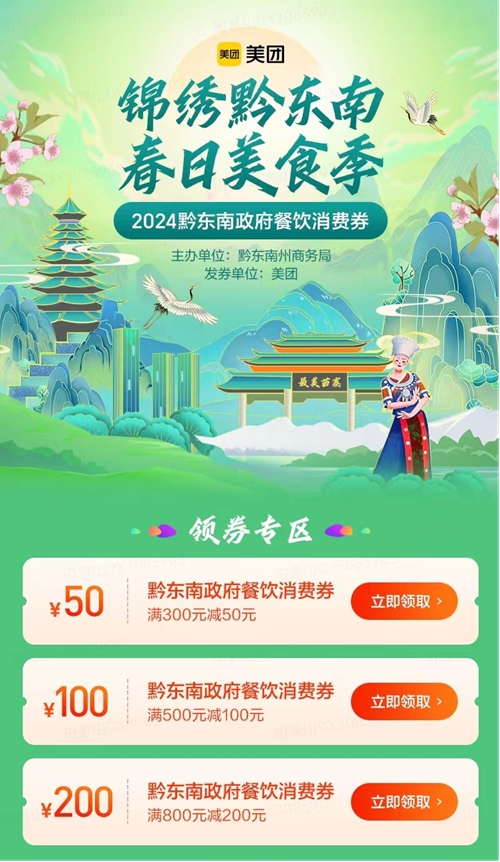 第二轮2024年“锦绣黔东南·春日美食季”餐饮消费券将于3月19日10:00在美团APP和大众点评APP发放,发放时间为3月19日—3月22日。为方便消费者使用券,第二轮消费券有效期为3月19日—3月31日。