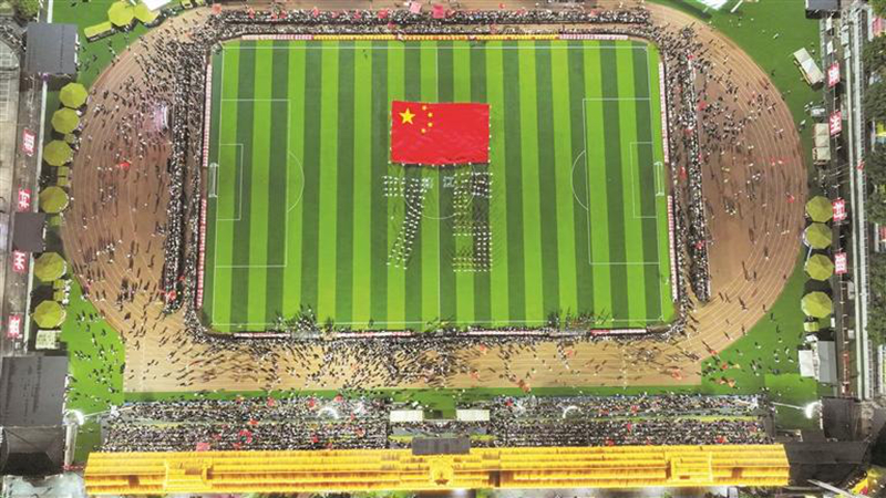 10月1日晚,第一届“一带一路”暨贵州-粤港澳大湾区“村超”足球友谊赛在黔东南州榕江县“村超”球场正式开赛。比赛间隙还进行了国庆专场文艺表演、烟花秀,在国庆佳节以其独特的方式向祖国献上了一份深情厚礼。图为群众在“村超”球场展开国旗并摆出“75”字样造型。