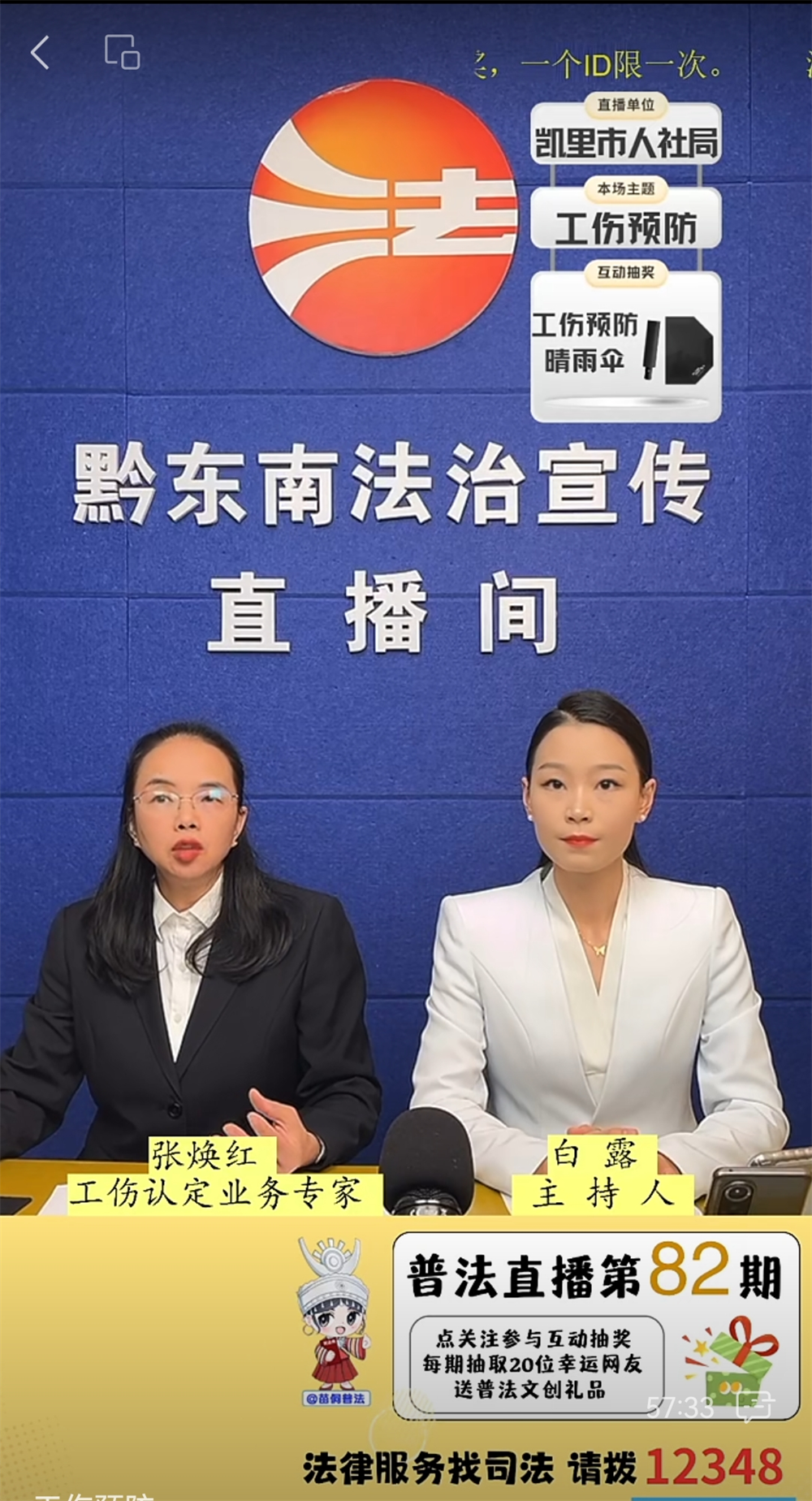 10月29日-30日,由凯里市人社局与黔东南州司法局合作,通过“苗侗普法”抖音号和“黔东南普法”微信视频号开展了“两个聚焦”工伤预防直播活动。所谓“两个聚焦”,即聚焦制造、建筑、环卫等重点行业职工工作一线和聚焦机关事业单位职工工作一线。