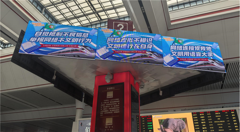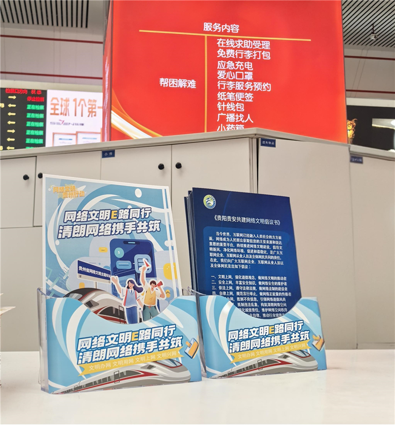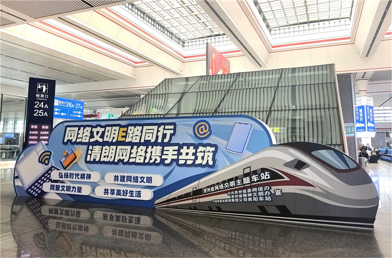 弘扬时代精神,共建网络文明,为进一步推进贵州网络文明建设,推动网络文明深入人心,2025年春运期间,由中共贵州省委网信办、贵州省精神文明办、中国铁路成都局集团公司贵阳车站共同建设推出的“网络文明主题车站”,于1月21日正式与广大旅客见面。车站围绕“网络文明E路同行,清朗网络携手共筑”主题,通过景观布置打造、开展网络文明志愿服务、推出网上网下网络文明实践等,宣介引导旅客们自律上网、依法上网、文明上网、安全上网,提升市民网络文明素养,号召大家共建共享网上美好精神家园。