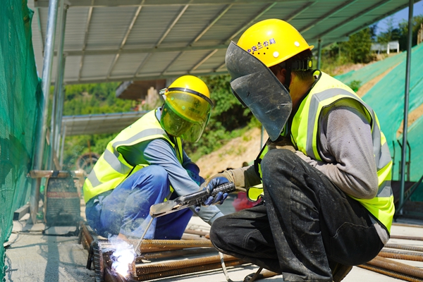 清晨,秋阳漫过车坝河,粼粼波光与已成型的桥墩倒影相映成景。在贵州省岑巩县水尾镇于河村大秧坪桥建设现场,工人们正专注地焊接钢筋,为预制T梁做准备。