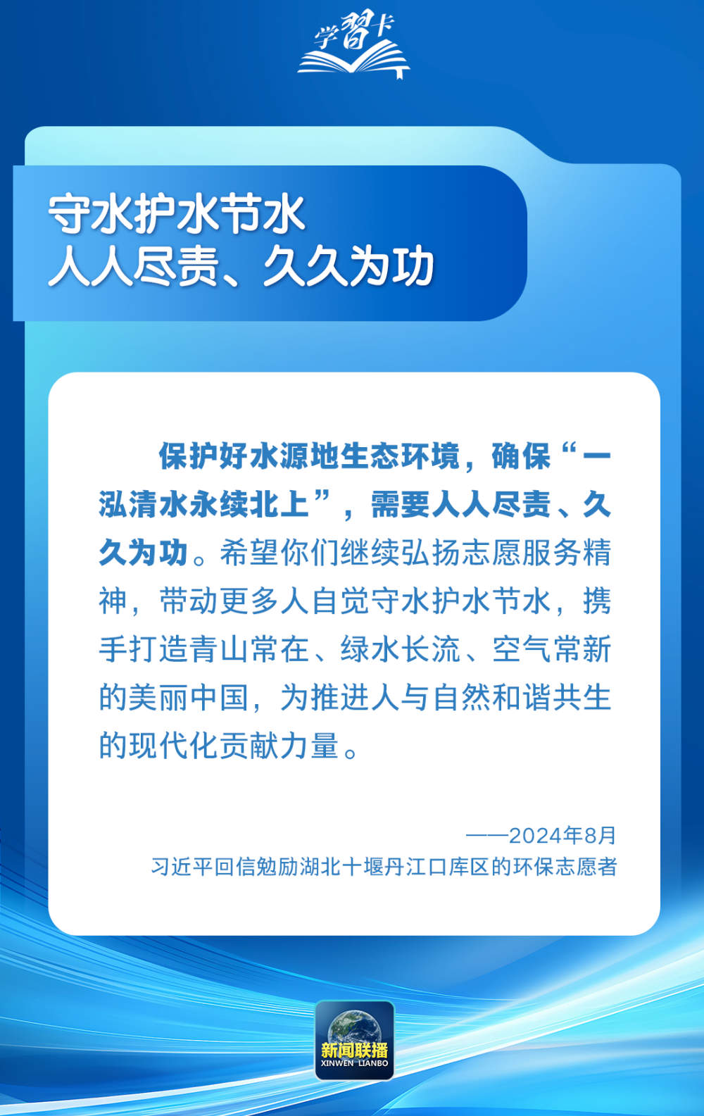 水是生存之本,文明之源。党的十八大以来,党中央统筹推进水灾害防治、水资源节约、水生态保护修复、水环境治理,建成了一批跨流域跨区域重大引调水工程。