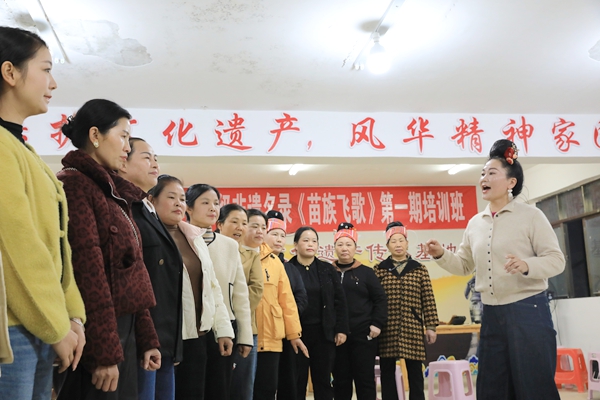 在革东寨村村委会活动室,悠扬婉转的苗族飞歌声声入耳。数十名歌者整齐排列,在老师的指挥下,一遍又一遍地打磨着入围全国村歌大赛总决赛的歌曲《春天好时光》。该歌曲在2025中国农民丰收节村歌大赛南部大区赛(正赛)中脱颖而出,位列前三,直接晋级全国总决赛。