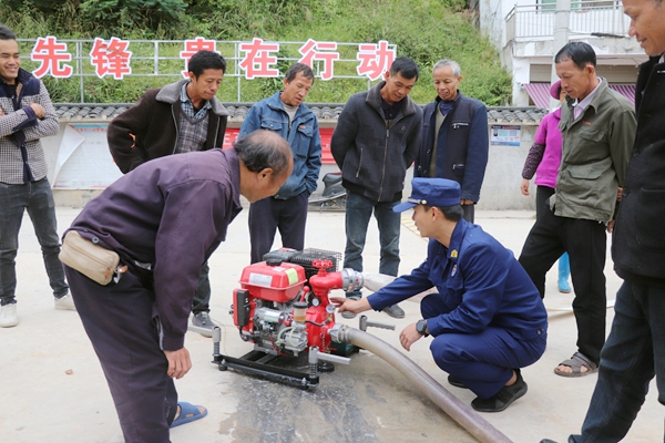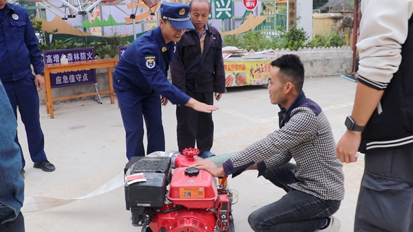 培训现场,消防员以“理论讲解+实操演示”相结合的方式,将专业知识转化为易懂易学的“实战指南”。消防员先是围绕灭火器、消防水带、机动泵等常用消防器材,详细讲解其分类标准、适用场景、操作步骤及日常保养要点,确保村民们先懂“原理”再练“技能”。在关键技能演示环节,消防员现场示范消防水带快速连接、机动泵规范启动、水枪喷射角度精准调整、灭火器“提、拔、握、压”四步操作法,以及使用后消防水带的整理收纳技巧,将每个动作拆解到位,全方位覆盖实操中的“关键细节”,让在场人员清晰掌握技能要点。