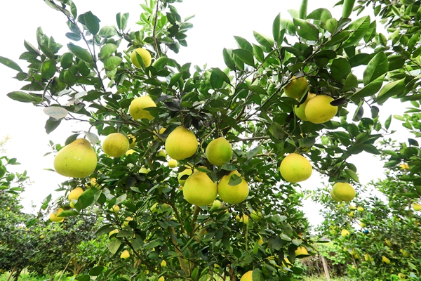 香柚园里,不时传来游客们的欢声笑语,几位游客正兴致勃勃拍照打卡,挑选心仪的果子,体验采摘的乐趣。