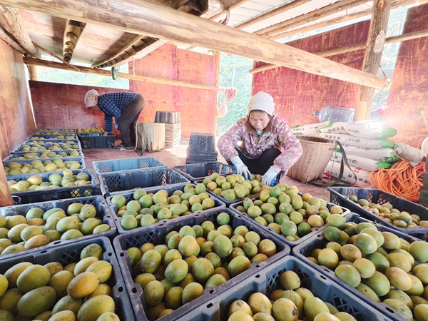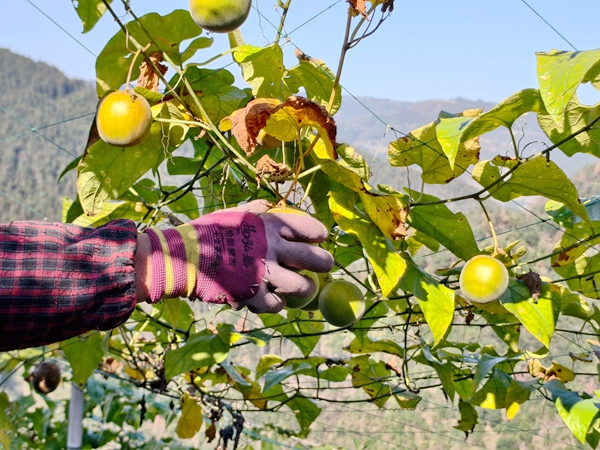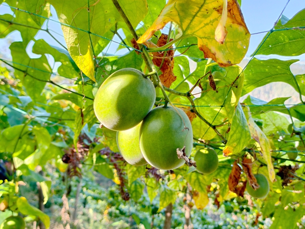 自2023年起,孟寨村与广西桂林三棱生物科技有限公司建立合作关系,实行“统一育苗+统一技术+统一收购”的管理模式,实现产销对接,为种植户托底。“现在是第三批采摘,广西老板自己来收购,目前我已经卖了5000多斤,今年种了100余亩,预计净赚8万元。”孟寨村罗汉果种植大户王远煜看着满框的罗汉果微笑着说道。