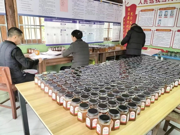近日,笔者走进贵州省锦屏县大同乡兴合章山村两委办公楼,在桌上整齐摆满着五倍子花蜜,工作人员正在井然有序分装打包产品,准备发往全国各地。