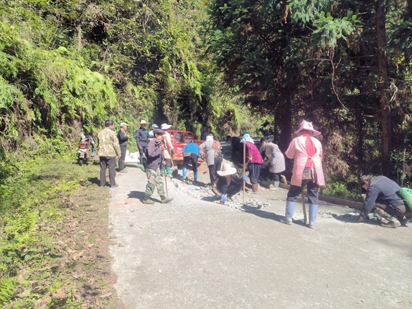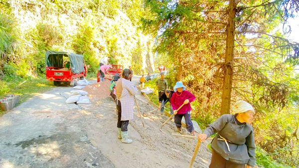 11月22日,污牙村通村主干道寨头路段一片繁忙景象,村民忙碌往来开展该路段的修整行动。