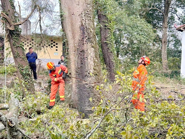 群众安全无小事,隐患整治刻不容缓。白垛乡迅速启动联动机制,主动对接县消防大队,与乡林业站、乡消防站组建专项整治工作组,明确分工、协同推进危险树木清理工作。为确保整治安全高效,工作组先对 3处隐患点逐一开展“一对一”现场勘察。林业站工作人员判断树木腐朽程度与倾倒风险,县消防大队和乡消防站人员结合周边民房、电线、道路分布,制定详细砍伐方案,明确切割角度、倾倒方向等操作细节;同时,提前组织专业伐木人员,调配绳索、油锯等工具,做好各项准备。