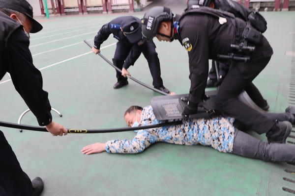 演练现场,一名“歹徒”持刀企图强行闯入校园。学校门卫发现后,立即持械阻拦并同步发出警报,校园安全负责人迅速启动“一键报警”系统。接到指令后,县特警突击组即刻驾车驰援,携带盾牌、警棍、防暴叉等专业器械火速抵达现场。随后,谈判疏导、现场封控、武力抓捕等处置环节同步展开,最终成功将“歹徒”制服并押上警车。整个处置过程反应迅速、配合紧密、措施得当,充分展现了警校双方高效的协同作战能力。