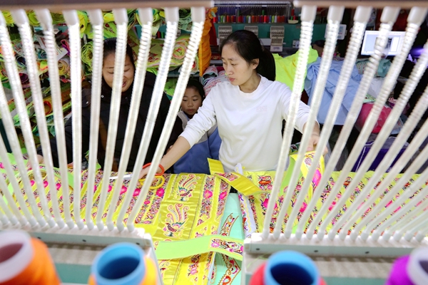 近日,在贵州省黔东南苗族侗族自治州榕江县忠诚镇忠诚社区的榕江县辉煌电脑绣花厂,绣花机在轰鸣,工人在忙于生产线上剪线头、穿针、调试绣花机等,抢抓工时,赶制订单。 入冬以来,榕江县乡村的各种民族活动增多,备办节日盛装进入高峰期,民族服饰特色绣片成为当地抢手产品,产销进入旺季,绣花厂在抢抓工时赶制订单供应市场助增收。