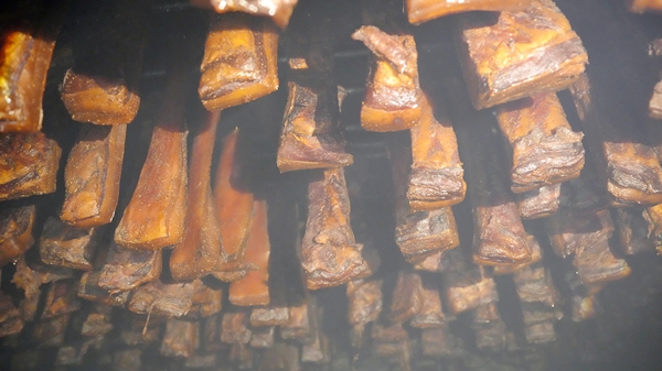 14间标准化烤房火力全开,一缕缕青烟裹挟着青冈木的香气缓缓飘散,熏制架上一排排色泽金红、油脂晶莹的腊肉正静静等待着时间的馈赠。烤房内,公司负责人杨天才在仔细翻动着肉块,控制着火候,确保每一块腊肉都能均匀受热,熏出最地道的风味。