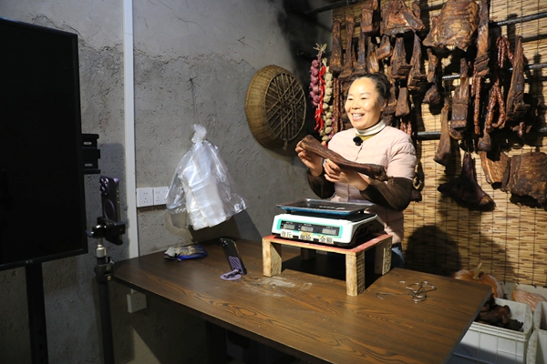 与传统烤房里的静谧劳作相映成趣的,是公司直播间里传出的热情洋溢的带货声。“家人们看,这块精品三线五花腊肉就是我们刚刚从烤房里取出来的,肥瘦相间,熏香扑鼻。”主播瞿光竹手持一块刚出炉的腊肉,在镜头前展示着纹理与色泽。她身后,晾晒架上挂满腊肉的场景清晰可见,直播间仿佛成了连接传统工艺与现代消费的桥梁。