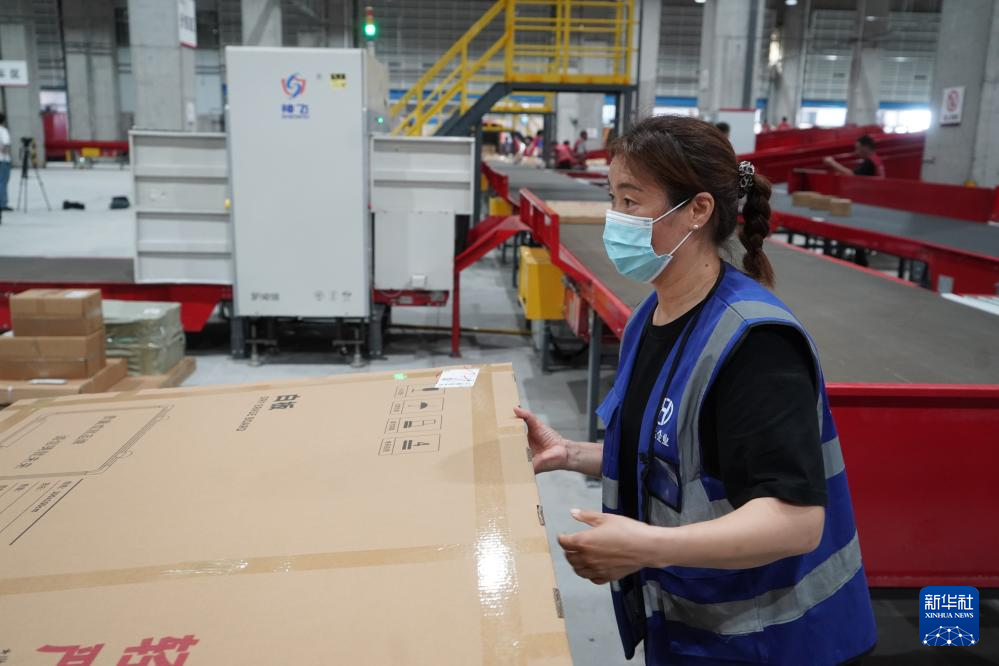 沭阳县华东智慧物流园卸车区的工人在搬运货物(7月23日摄)。新华社发(刘臻睿摄)