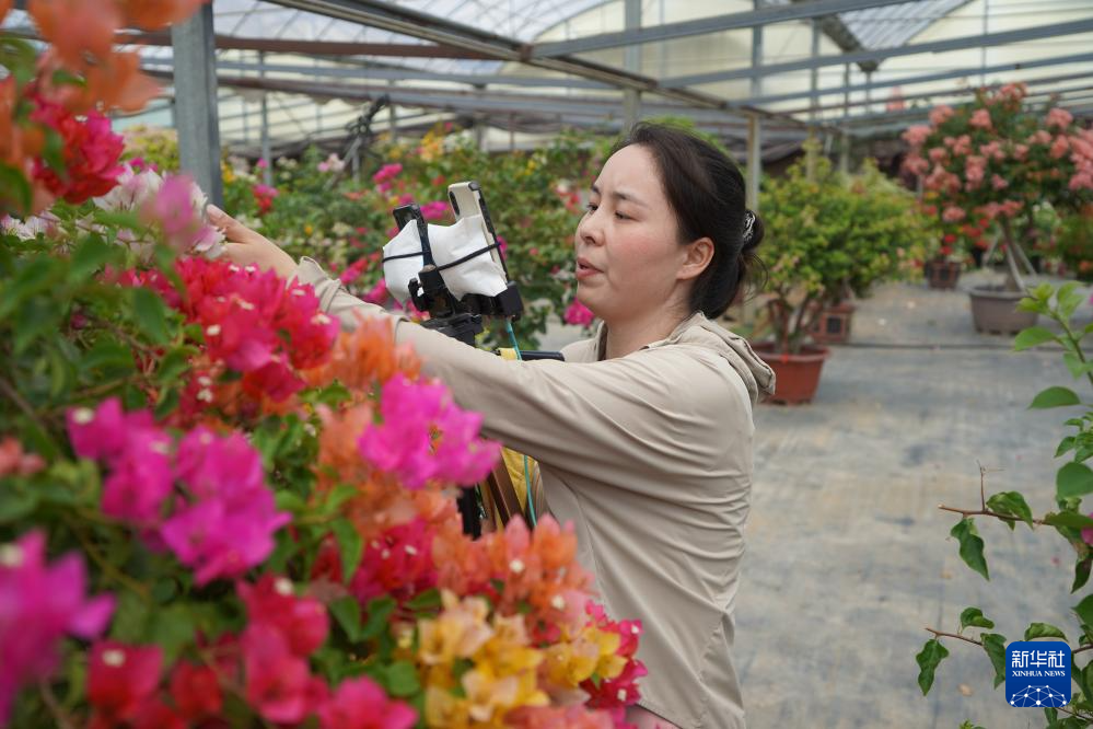 沭阳县新河镇新槐社区居民陈浩在网络直播中推介三角梅(7月23日摄)。新华社发(刘臻睿摄)