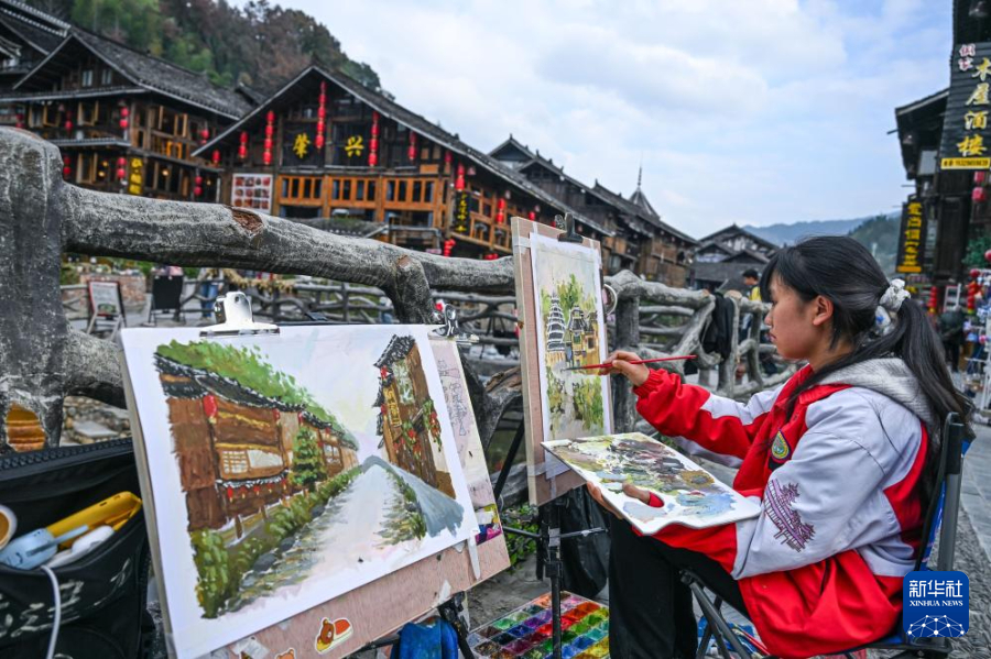 学生在贵州省黎平县肇兴侗寨写生(12月19日摄)。新华社记者杨文斌 摄