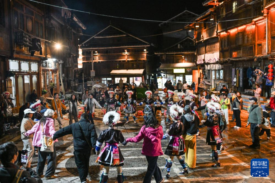 在贵州省黎平县肇兴侗寨,游客与村民在一起跳舞(12月19日摄)。新华社记者杨文斌 摄