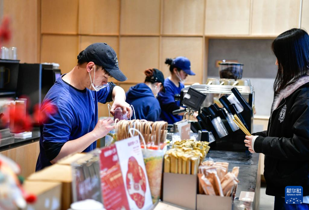 贵阳市云岩区友谊路“去茶山”饮品店的员工在给顾客打包新茶饮(2025年12月23日摄)。新华社记者杨文斌 摄